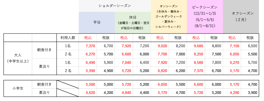 ※宿泊料金は朝食付き・税込みです。(素泊り料金は御電話で確認してください。)
